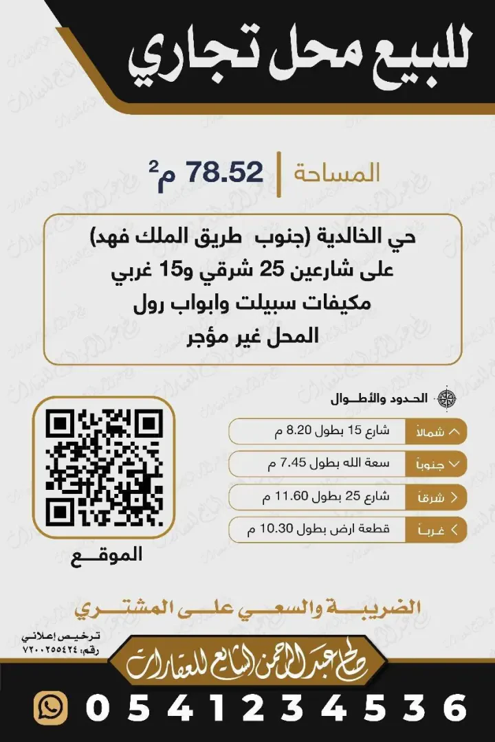 حي الخالدية (جنوب طريق الملك فهد) على شارعين 25 شرقي و15 غربي مكيفات سبيلت وابواب رول المحل غير مؤجر